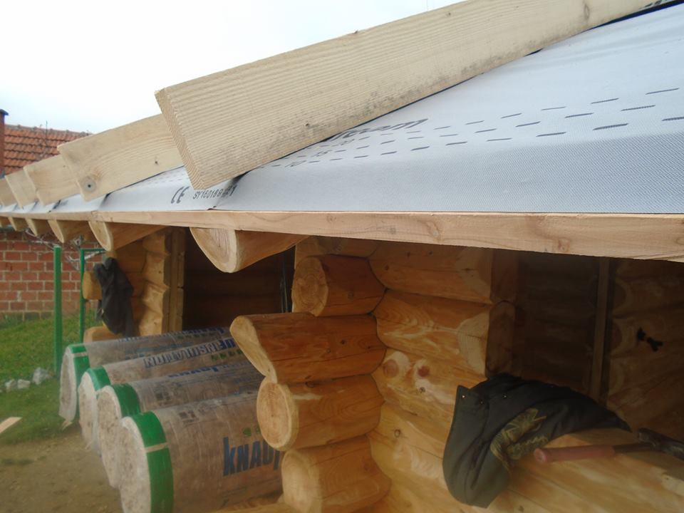 Malo fotografija oko nekih detalja kod gradnje drvene kuće, a važno je za buduće investitore. Prilikom gradnje krovišta uglavnom izvodimo potpuno završen krov u donjem pogledu u rustikalnoj izvedbi , dok na gornjem dijelu izrađujemo krov sa izolacijom - dva sloja folije i međusobna ispuna od eko mineralne vune. Tek nakon polaganja izolacije montiramo kontra letvu za zračni prostor i letvu za prihvat crijepa. Ostali detalji odnose se na pripremu otvora za montažu prozora i detalji za pripremu provođenja električnih vodova.